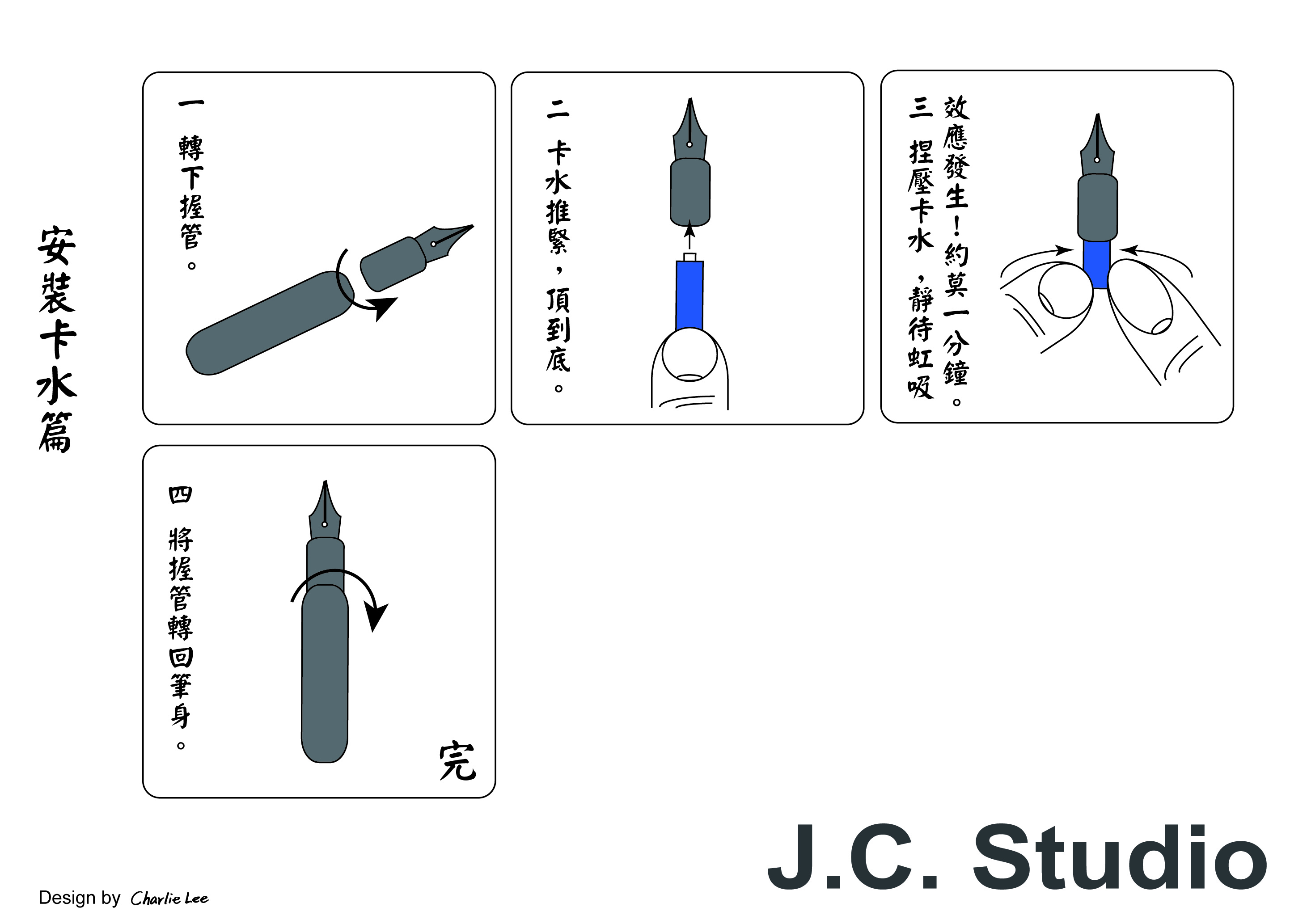 這是不對的呦 , 需要靜置片刻 讓筆舌中的儲墨槽確實充滿了墨水再去書寫.