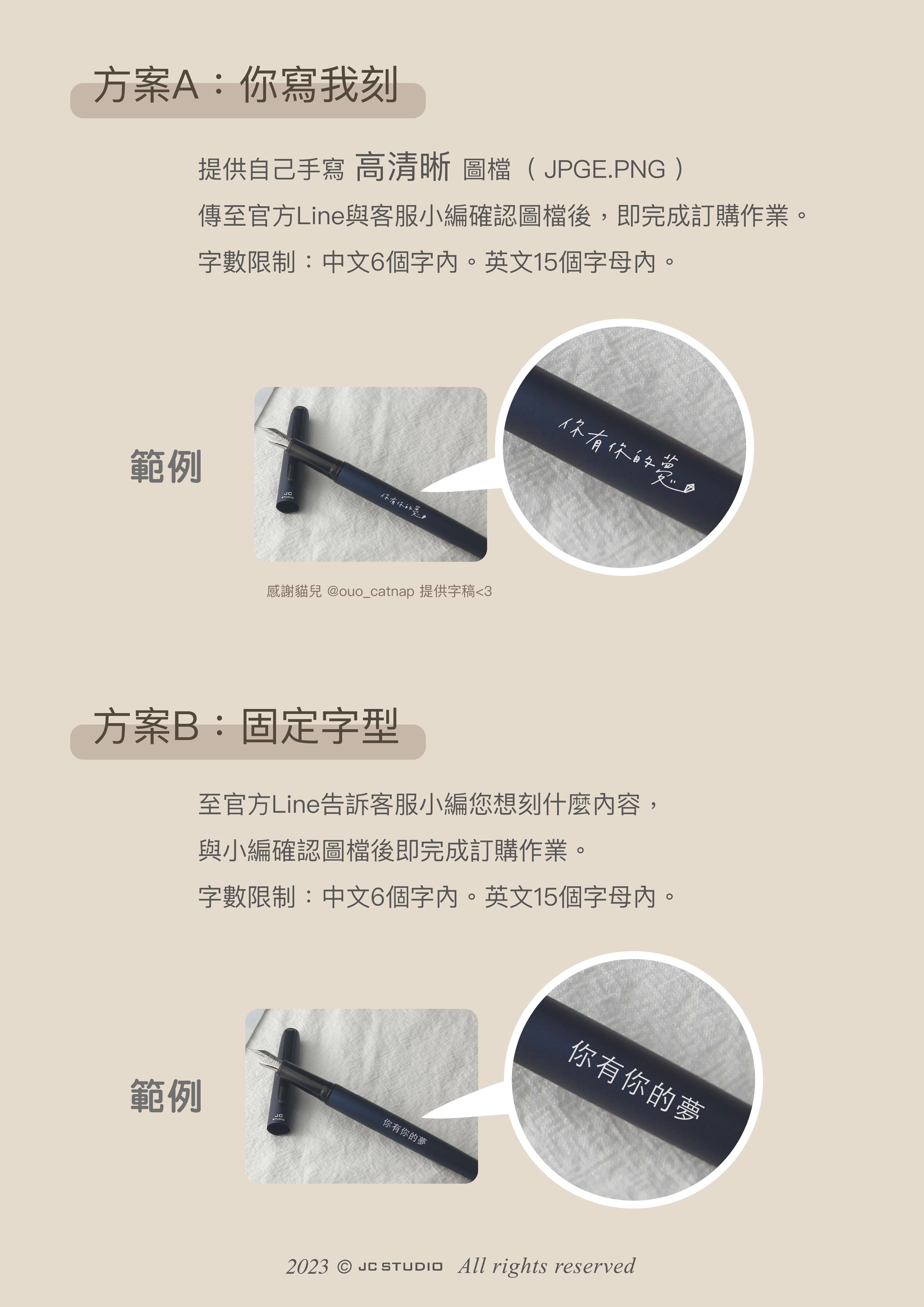 下單付款→主動聯絡官方賴小編→傳字稿或圖檔及訂單號碼→與小編確認圖稿內容→等待製作天數→完成→收到美美的鋼筆→ 送禮超有面子der→自己拿來寫也超爽der !