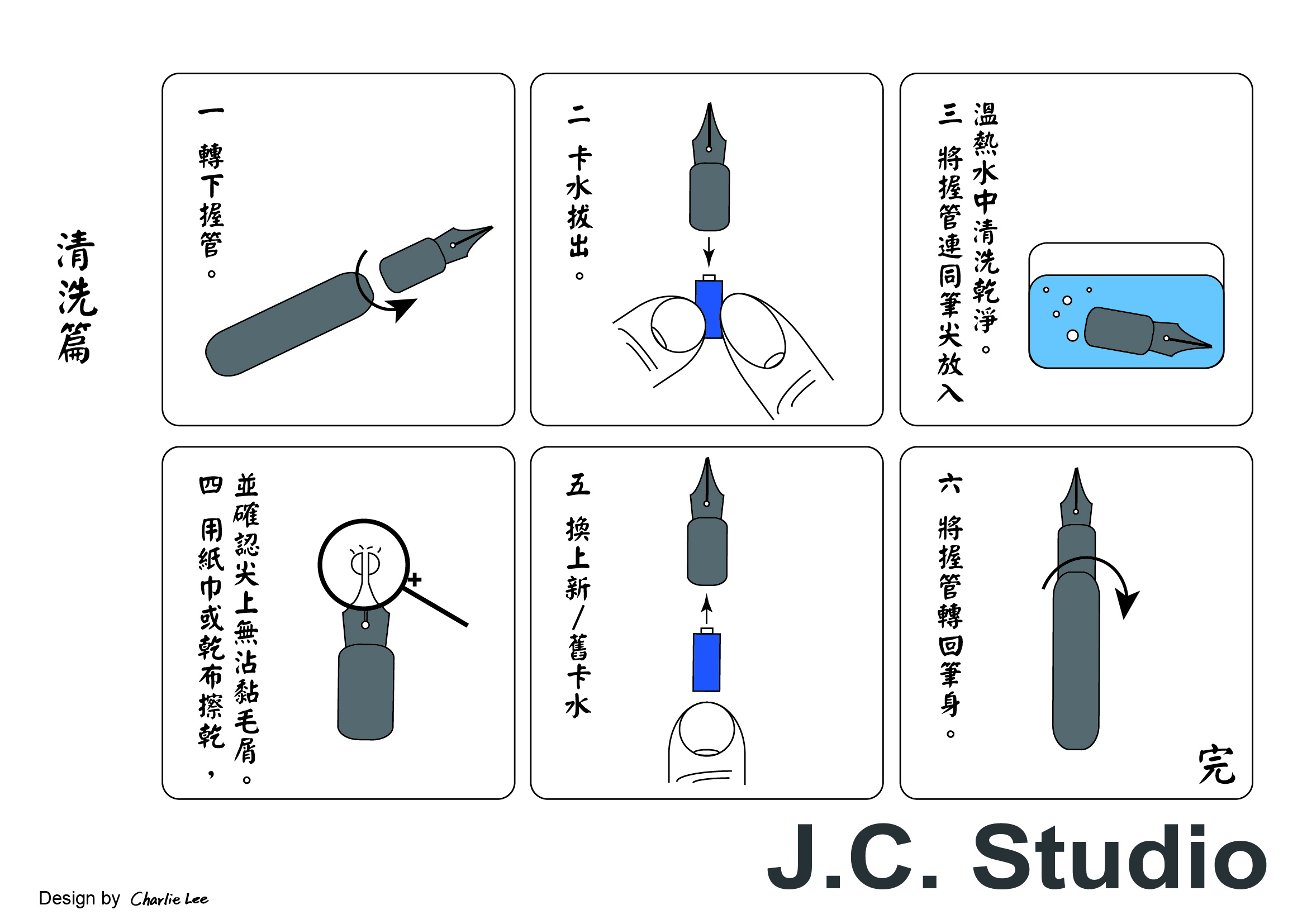 其實原理都是一樣的,讓乾淨的水進出吸墨器與筆舌筆尖的通道